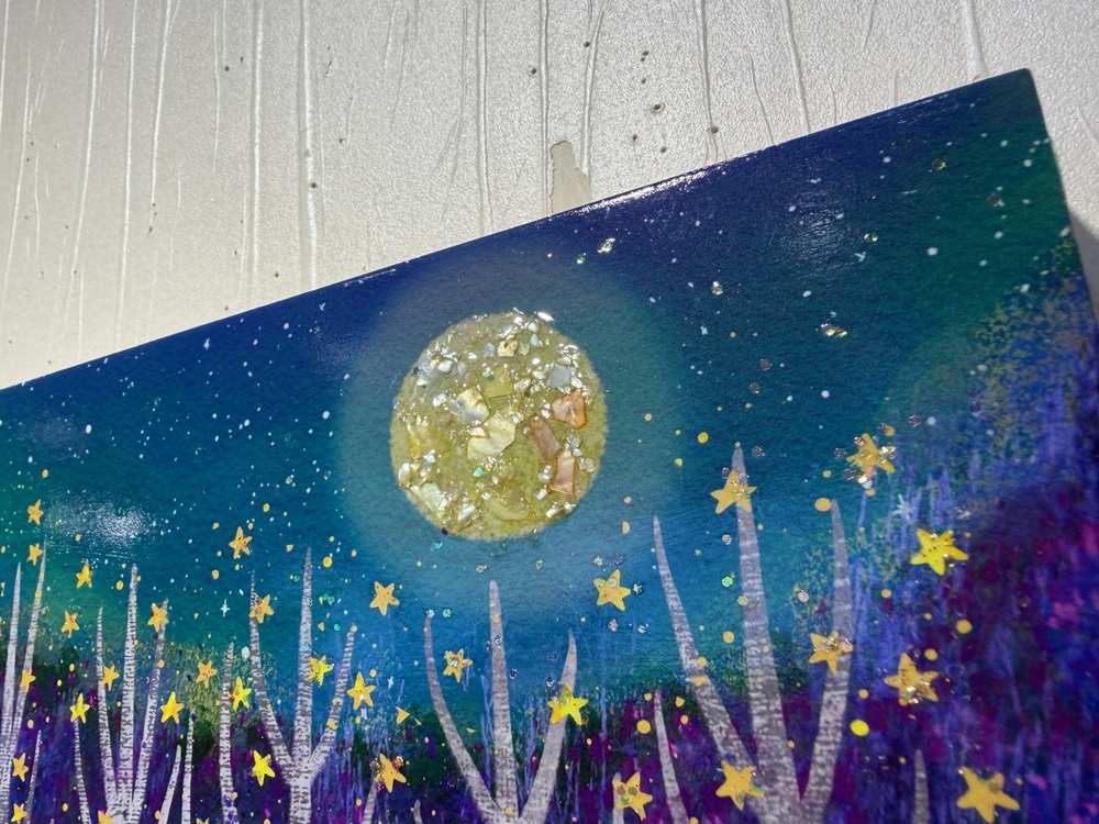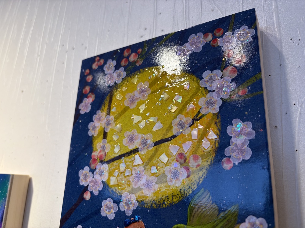 例えば、今回Yumi + Artさんオススメの「月がきれいですね〜春告草とメジロたち〜」では、月部分にシェルが、夜空部分にもホログラムが配され、幻想的な夜空を表現しています。
