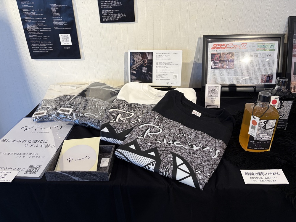 少し前からは、八王子発のアパレルブランド「Riar’s design(ライアーズ デザイン)」とコラボしたアパレル展開も始まり、会場にはコラボしたTシャツが展示されていました。