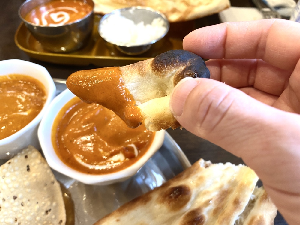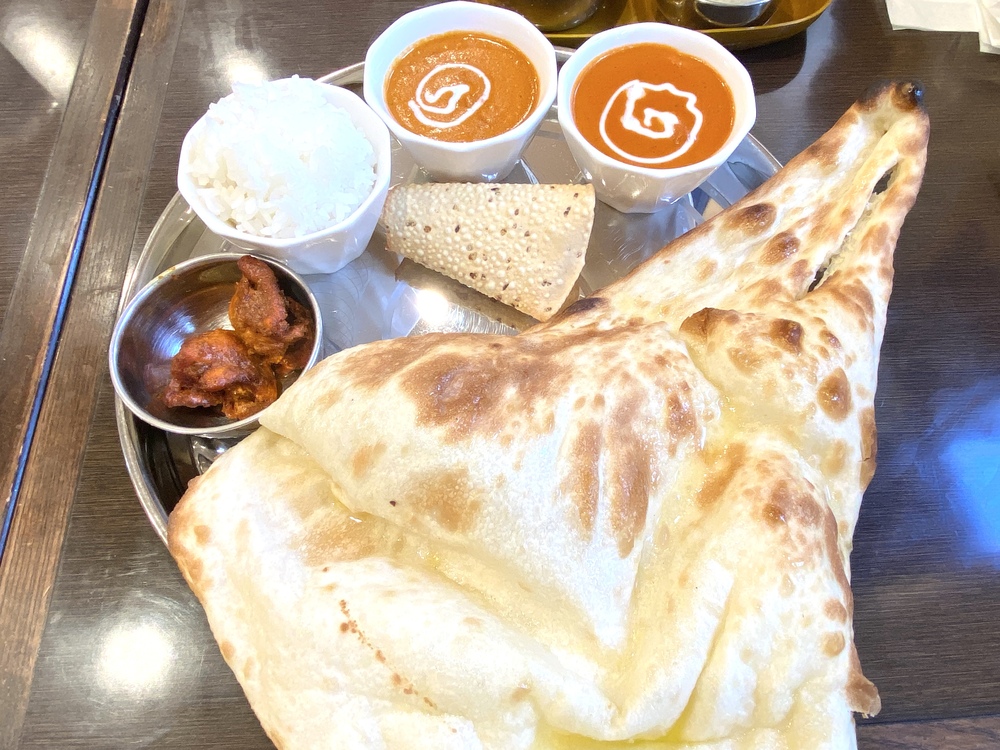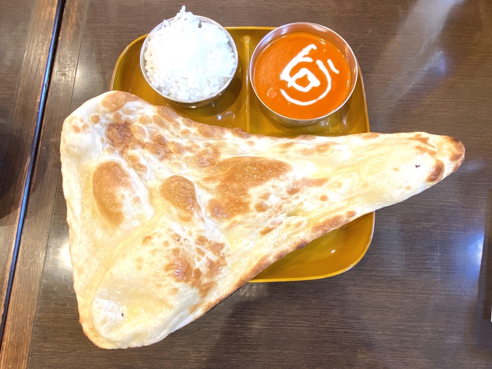 テーブル半分ほどもありそうなサイズで、カリッと香ばしく焼かれたナンはほんのり甘く、カレーとの相性も抜群です。