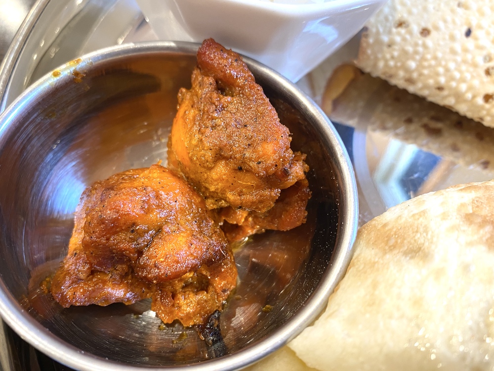 セットにはカレー2種とチキンティッカという骨なしのチキン、インドのおせんべいパパドが付いてきます。