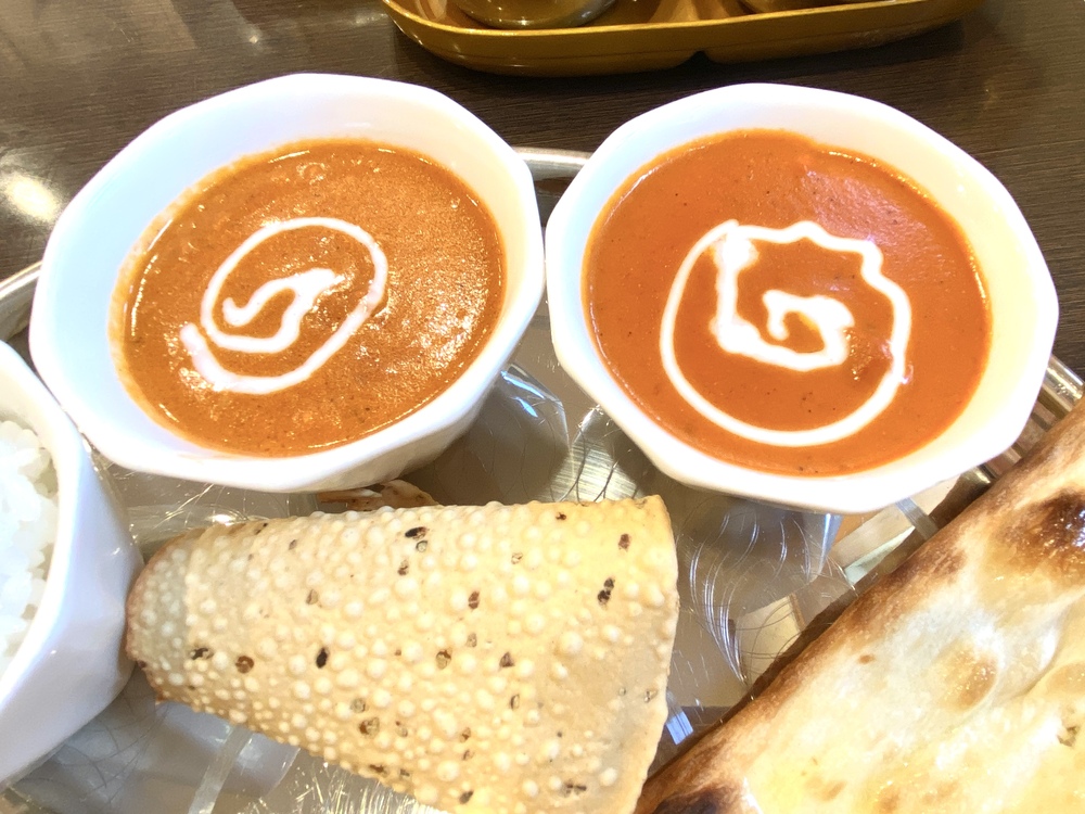 私は、2種類のカレーが楽しめるレディースセットを注文し、バターチキンカレーとキーマカレーを選びました。