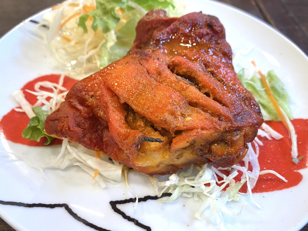 骨付きのタンドリーチキンは香ばしい焼き色が食欲をそそります。