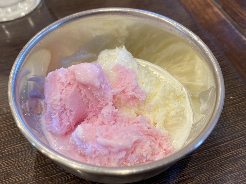 お子さまセットにはデザートのアイスがつき、バニラとストロベリーのアイスに子どもも大喜びでした。
