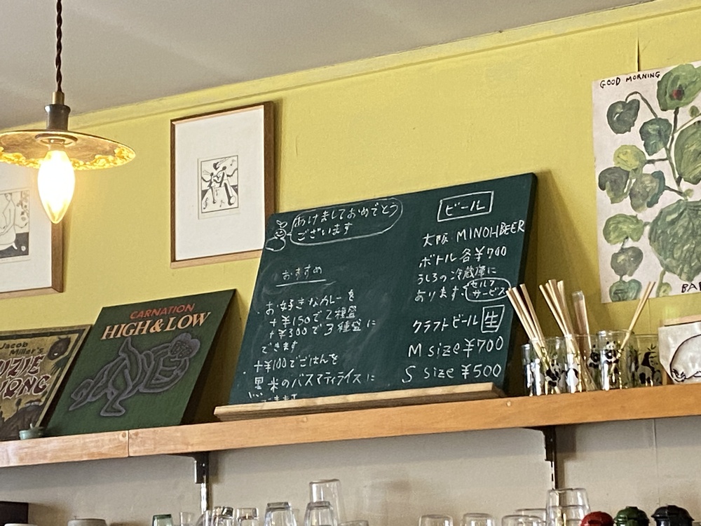 棚にはさまざまなスパイスの瓶が並び、ボードにはその日のおすすめが丁寧に書かれています。