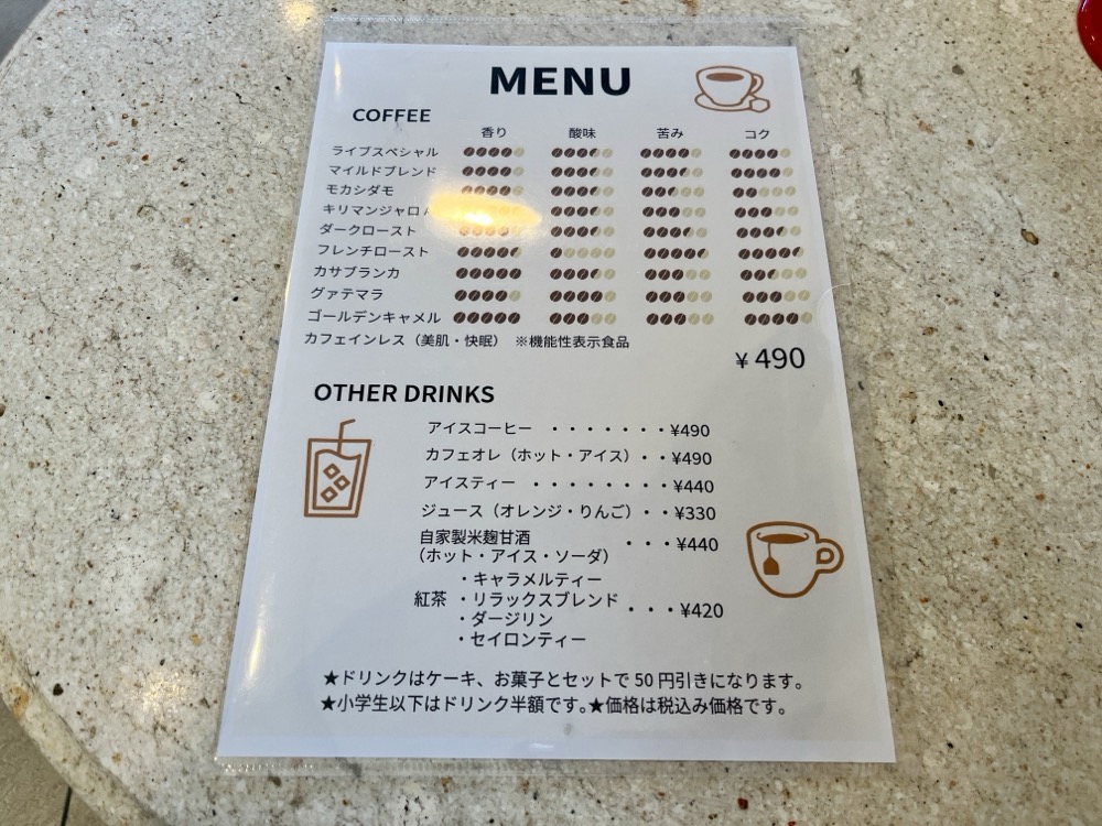 コーヒーは種類豊富で「香り」「酸味」「苦味」「コク」が表示されたメニュー表があり、好みのコーヒーを選ぶことができます。