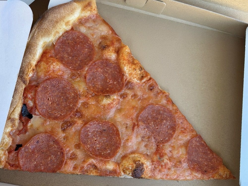 ショーケースの前で迷った結果、今回はアメリカンピザの定番「ペパロニピザ」をいただくことにしました。テイクアウトの専用箱を開くと、何度見ても感動なビッグサイズピザが登場!