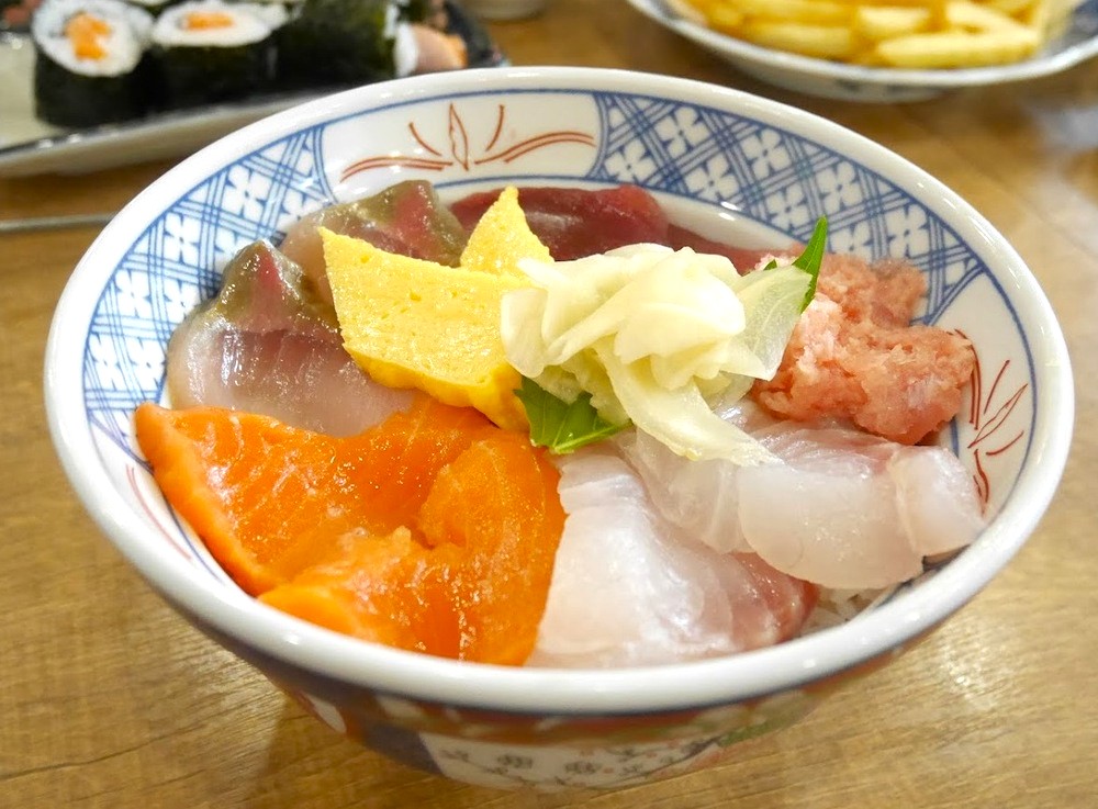 磯丸5色丼で楽しめるのは、マグロ・サーモン・ネギトロ・ブリ・タイ。