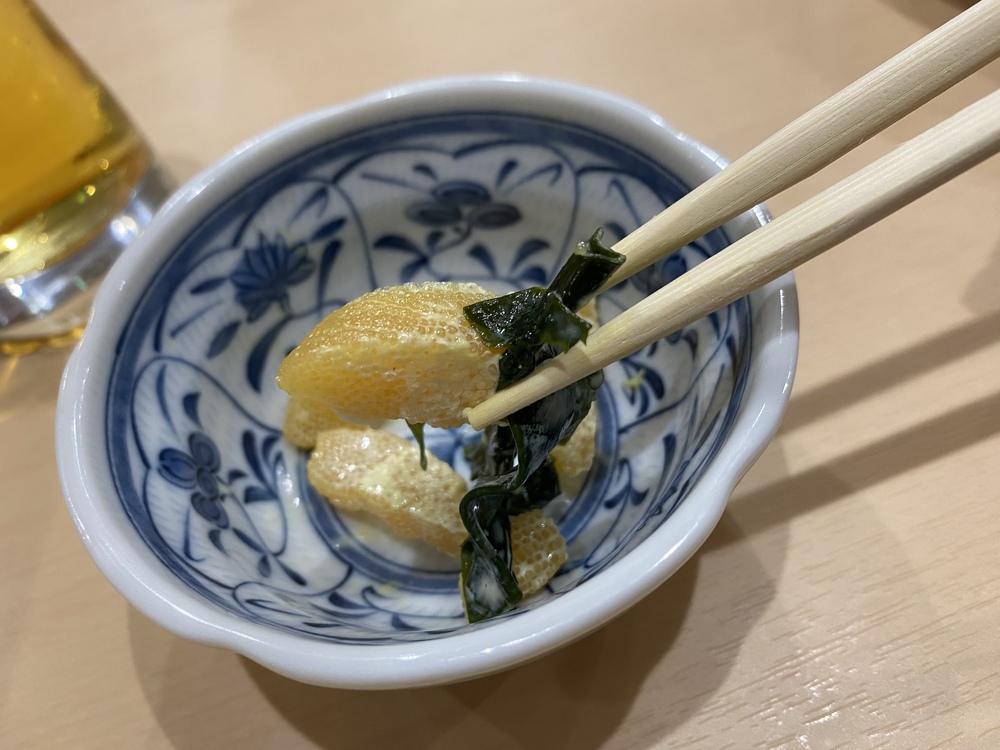 この日のお通しは、数の子とわかめのマヨネーズ和え。