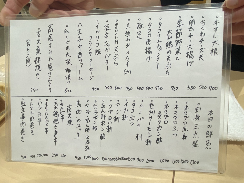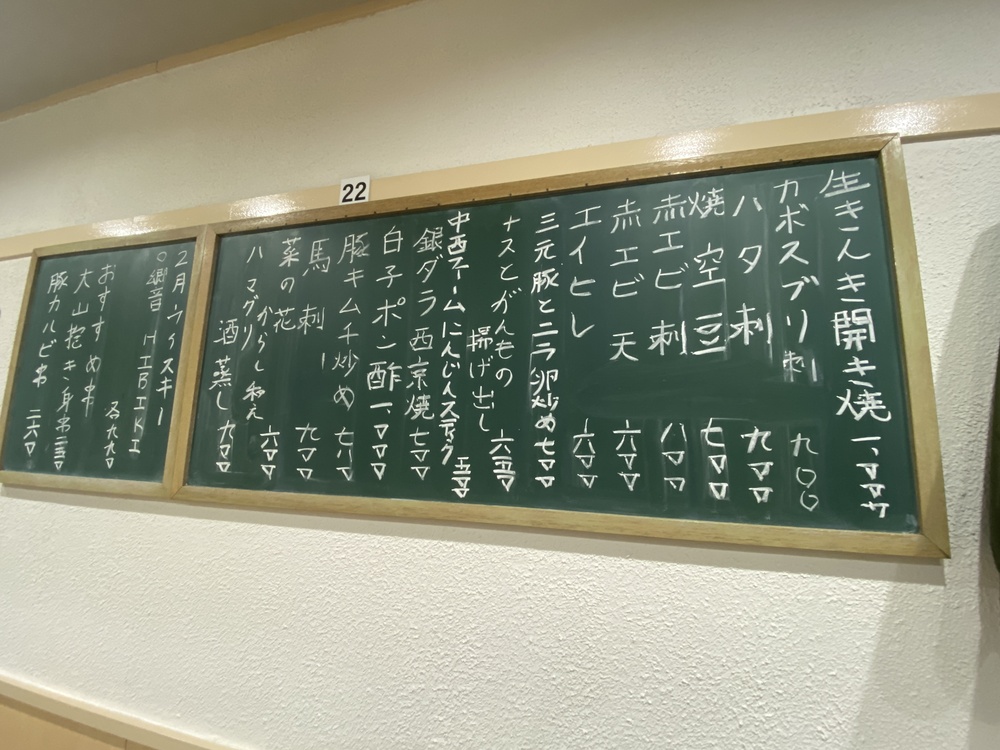 金太郎には、その日のおすすめメニューが黒板に、レギュラーメニューやこの店舗でのオリジナルメニューはメニュー表に記載されています。