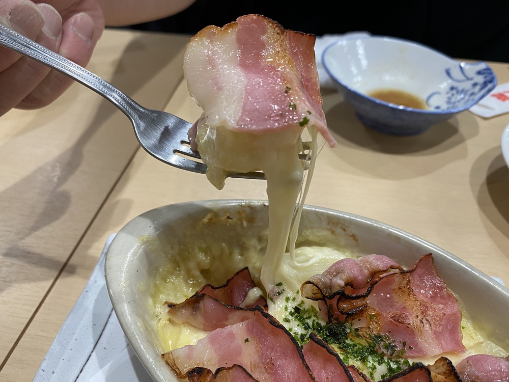 今回は、ベーコンポテトチーズ焼きとハムカツを食べることにしました。