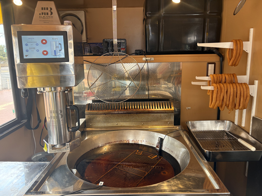 今回特別に、スペインから輸入したチュロスを絞って揚げる機械も見させていただきました。