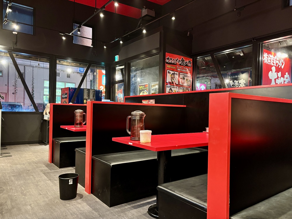 店内も、赤と黒で統一されたスタイリッシュな空間!私が訪れた時間は、仕事帰りの男性客だけでなく学校帰りの女子高生グループや家族連れなど、さまざまな世代のお客さんでにぎわっていました。