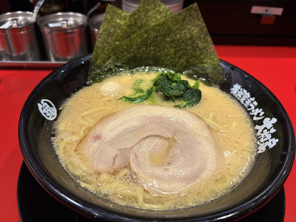 運ばれてきた一杯は、豚骨のうまみが凝縮されたまろやかでクリーミーなスープが絶品!家系ラーメンの特徴でもあるほうれんそうで箸休めをしつつ、どんどん食べ進めたくなるおいしさです。
