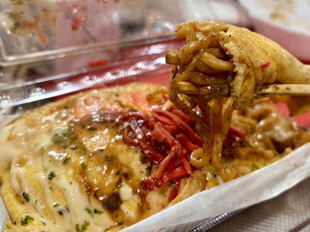 たこみつの魅力は、たこ焼きだけではありません。透明なパックいっぱいに詰められて提供される「やきそば」からは、店主のサービス精神が伝わってきます。手に取るとずっしりと重く、食べる前からうれしい満足感。