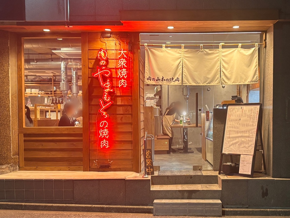 「肉のやまもとの焼肉」という店名がスタイリッシュに輝き、これまでの老舗の重厚なイメージとは一線を画す、現代的でキャッチーな雰囲気を演出しています。