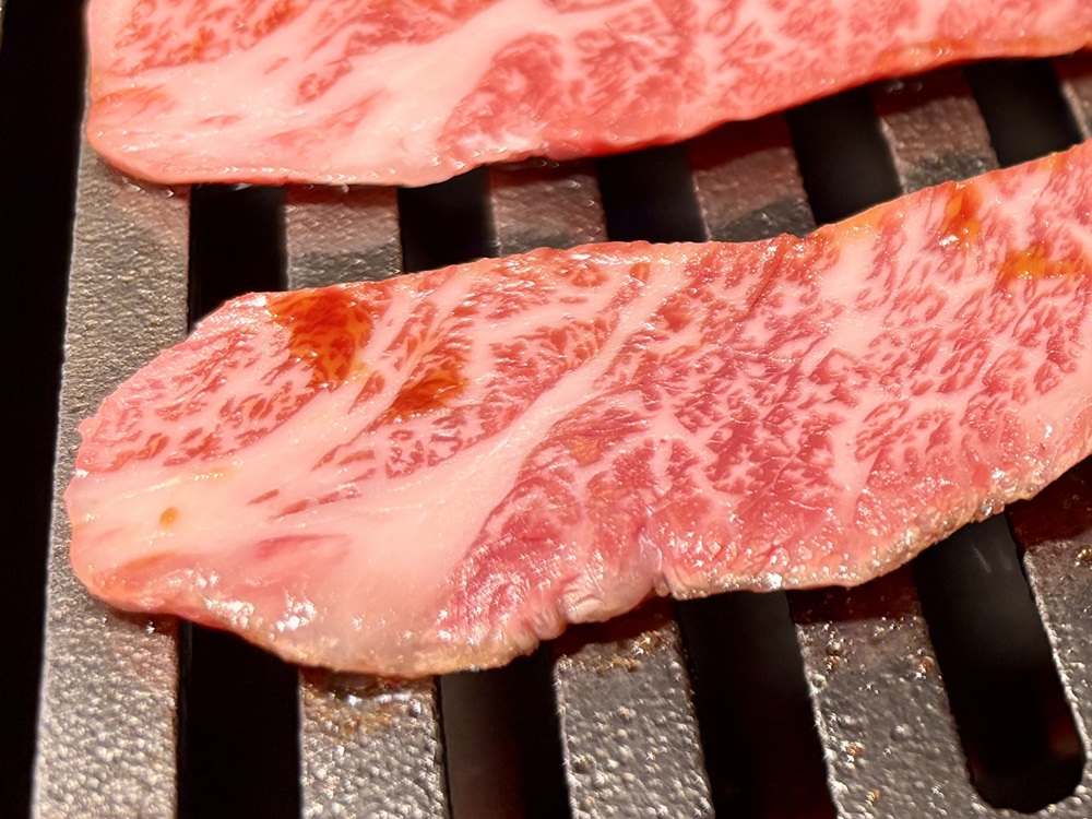 きれいにサシが入ったお肉を網にのせると、脂が弾ける音とともに芳醇な香りが立ち上ります。