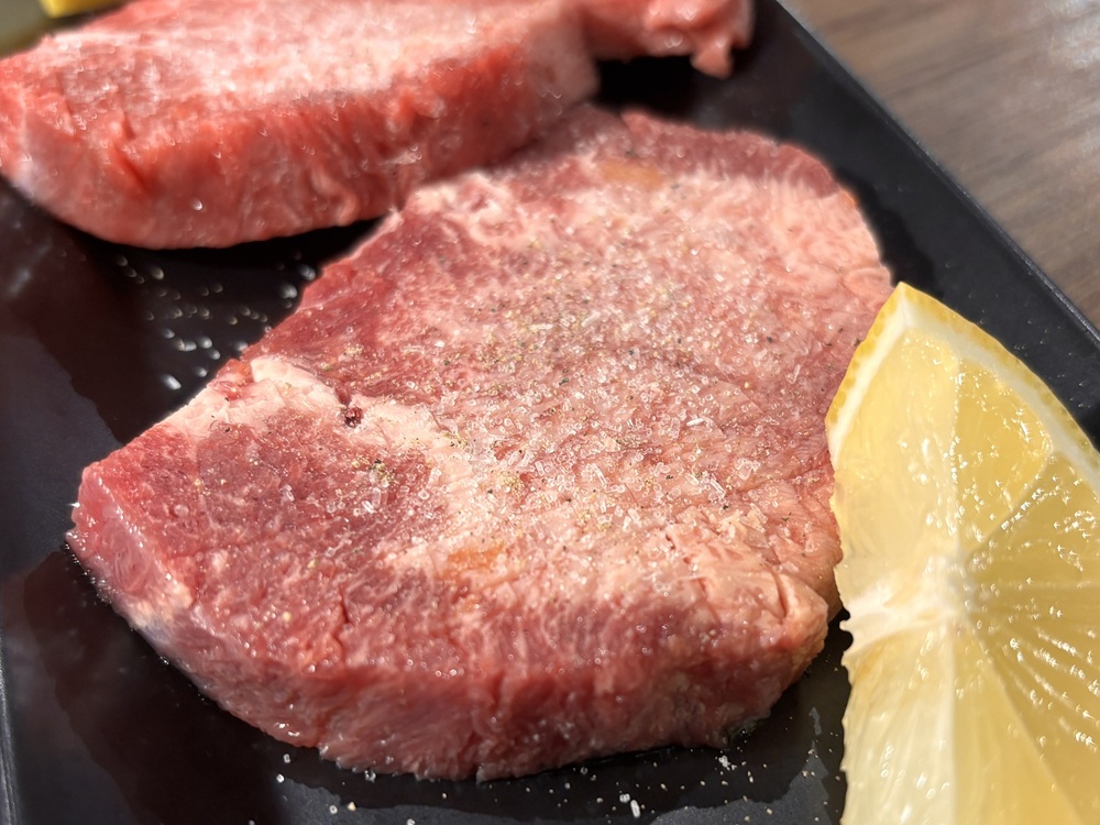分厚いタンには、あらかじめ細かく隠し包丁が入れられています。この下処理のおかげで、厚みがありながらも火が通りやすく、焼き上がると花が咲いたようなビジュアルに変化します。