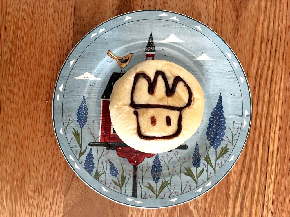 続いて、地元の山田小学校5年2組の子どもたちが考えた、山田小のマスコットキャラクター「もるん」をモチーフにした「もるんパン」をいただきました。