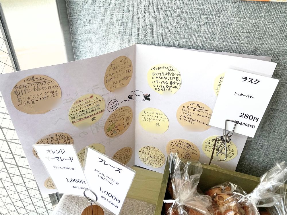 もるんパンを作った山田小学校5年2組の子どもたちから、お店への感謝の手紙だそうです。